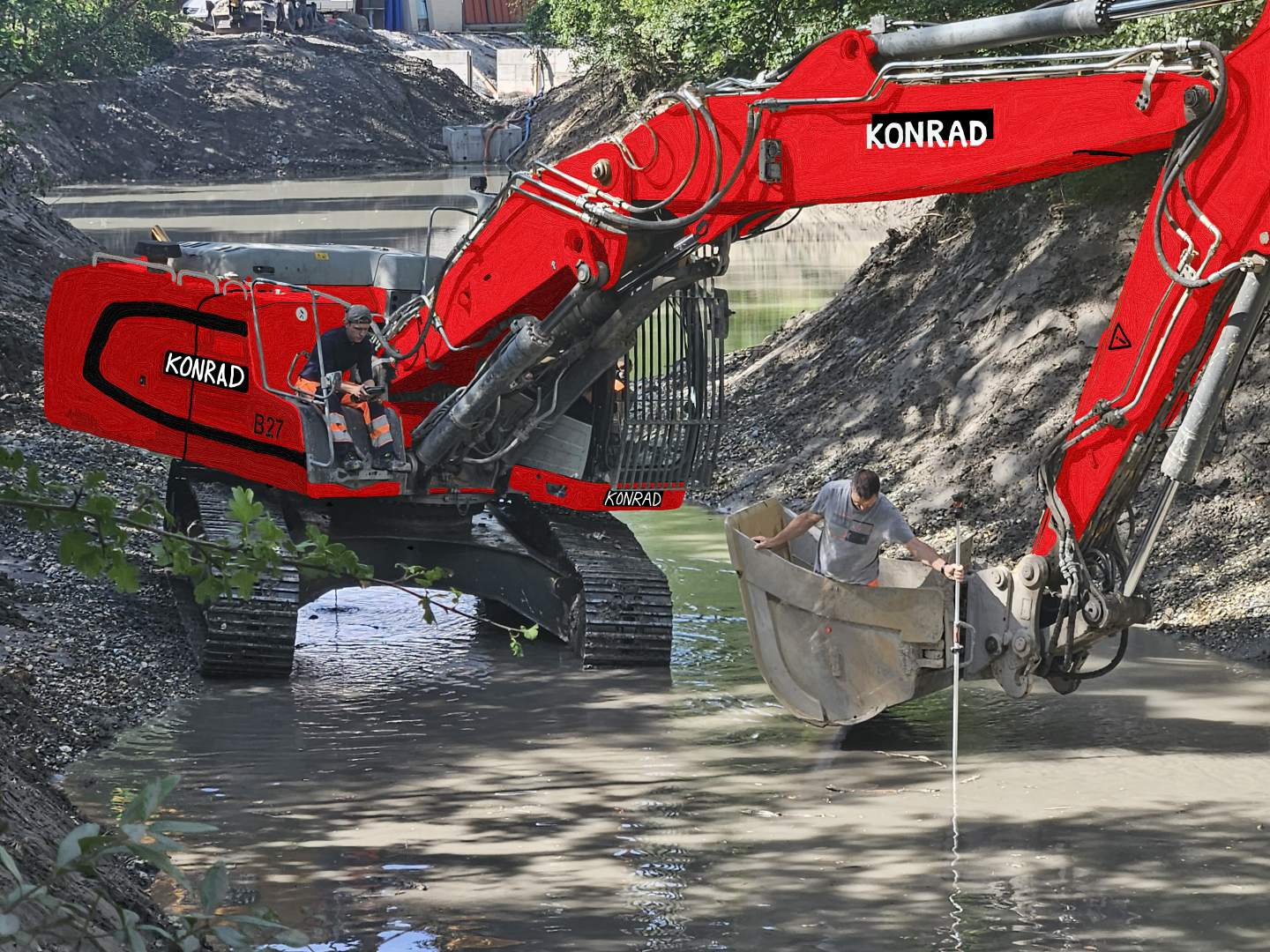 Für die Aufnahme der Sohle des Schlammsammlers im Zusammenhang mit dem Projekt Schlammauflandung Schaan musste unser Vermesserteam erfinderisch werden. Weil die Sohle unter dem Wasser nicht ersichtlich war, wurde der Bagger der Frickbau AG kurzerhand zum neuen Arbeitsgerät von Marco und Gabriel umfunktioniert.