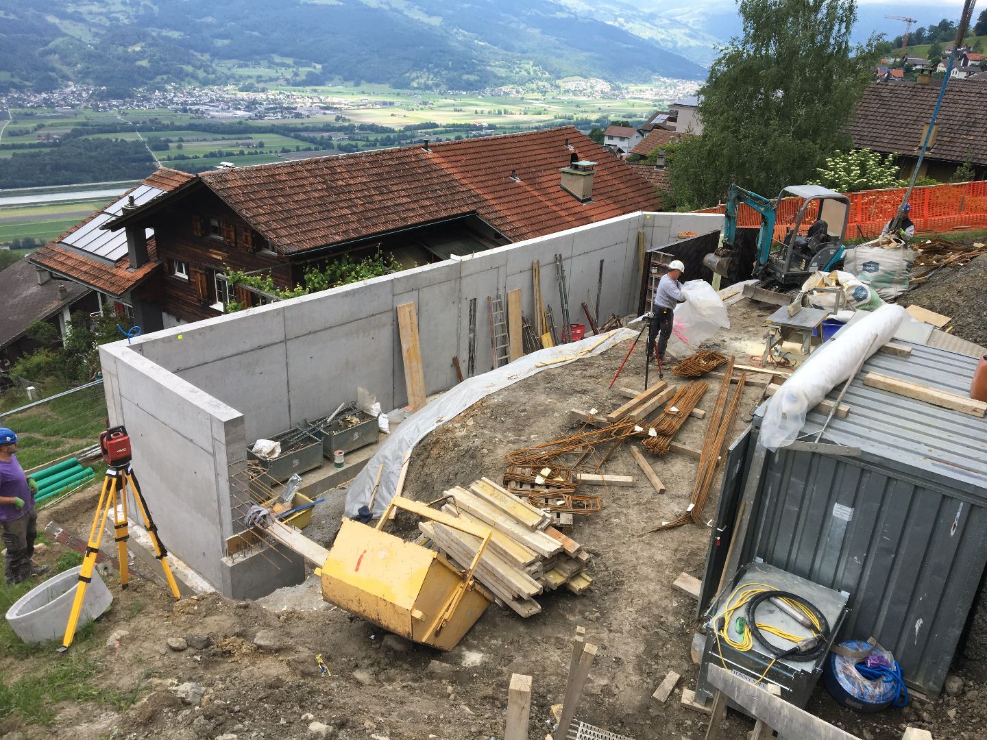 Das Einfamilienhaus mit seiner besonderen Grundrissform liegt nahe dem Zentrum in Triesenberg. Aufgrund der Hanglage wurden die Umgebung und die Fundation des Bauwerks etappenweise ausgeführt.